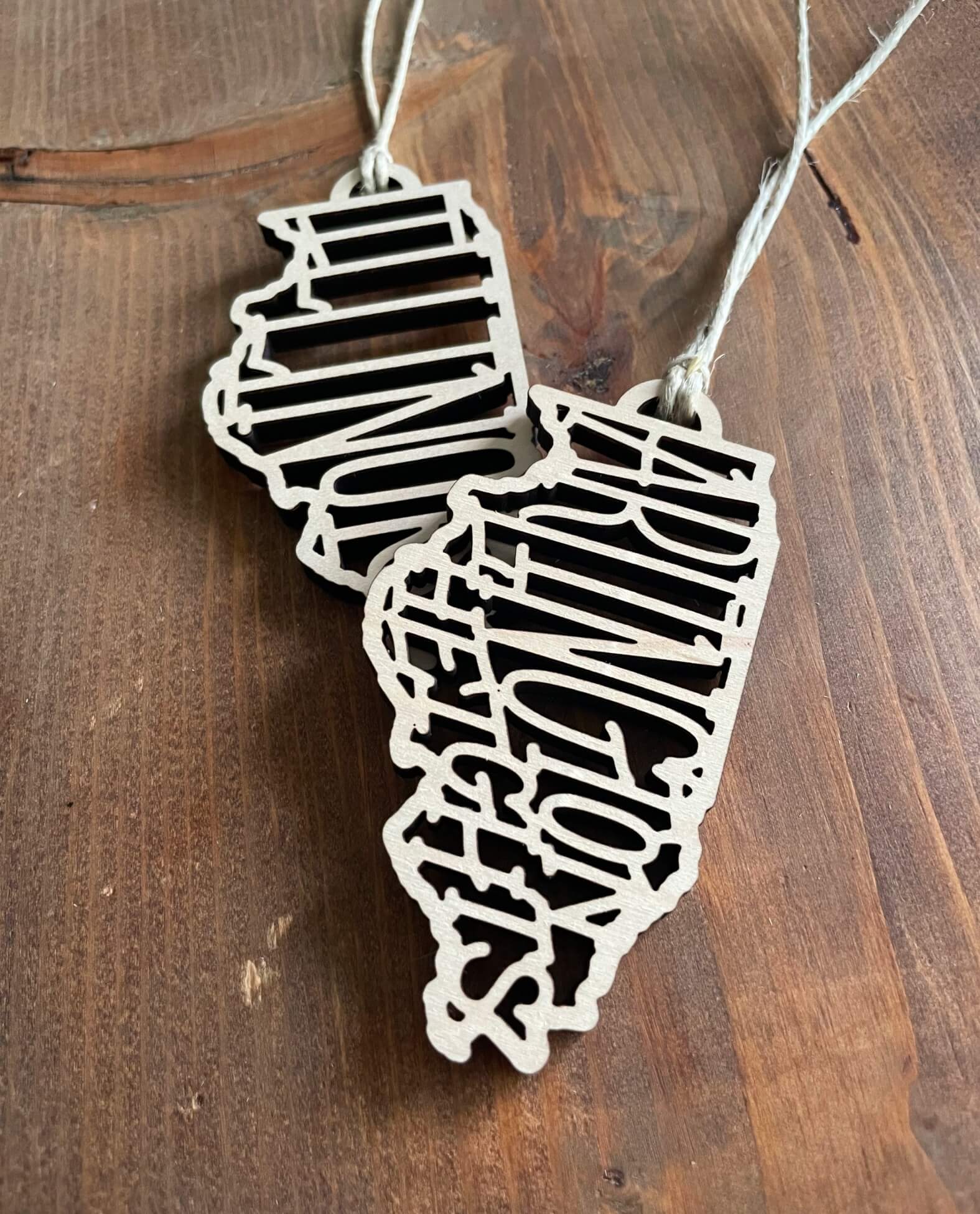 Hand lettered Arlington Heights, IL Ornament made out of laser cut wood.