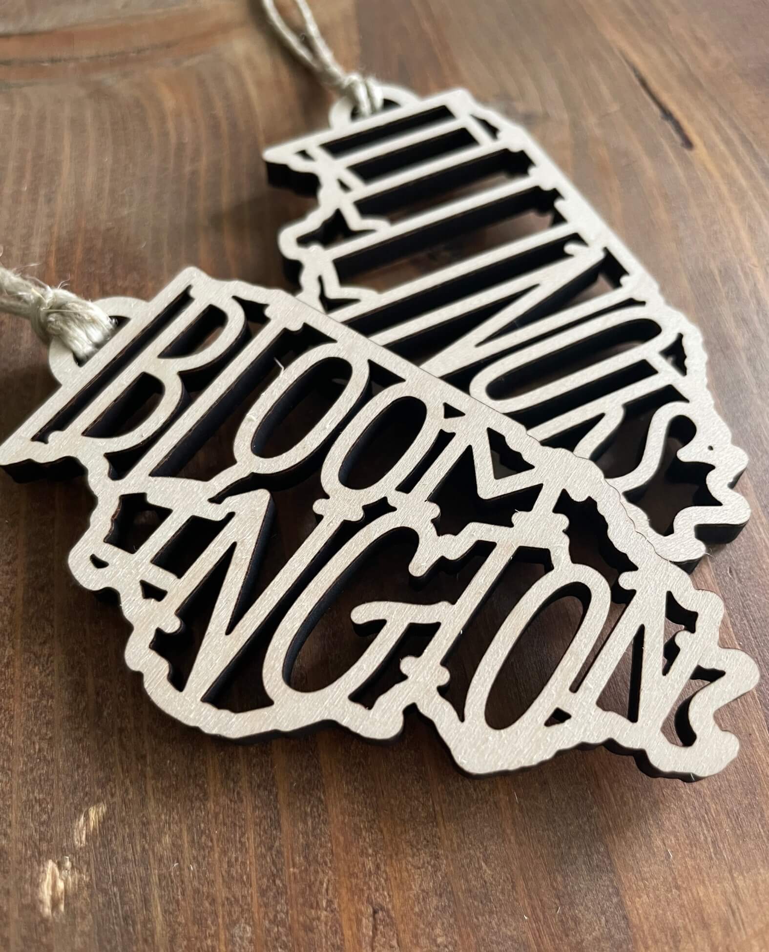 Hand lettered Bloomington, IL Ornament made out of laser cut wood.