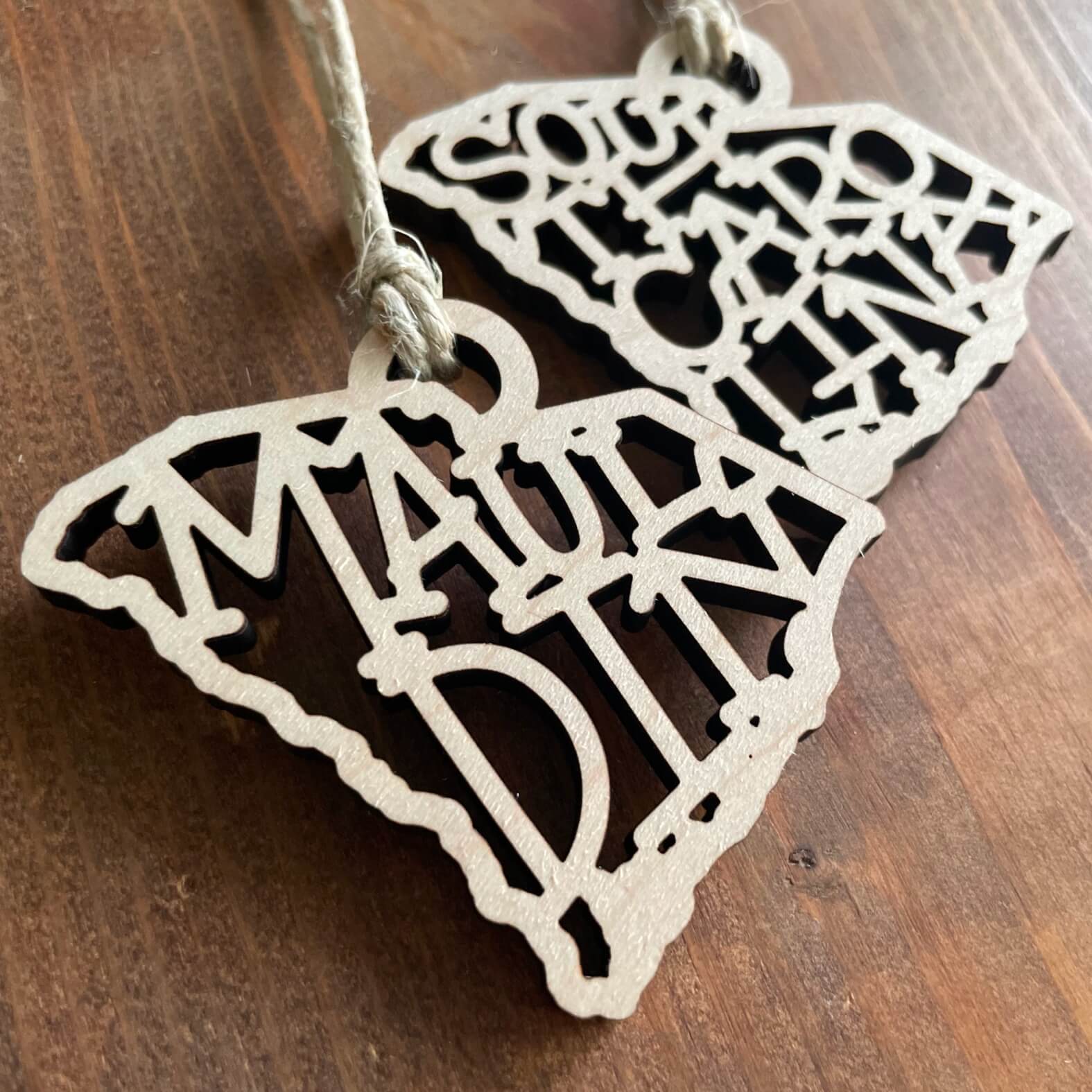 Hand lettered Mauldin, SC Ornament made out of laser cut wood.