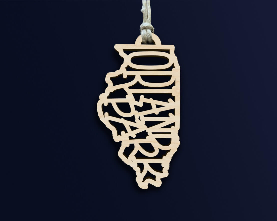 Hand lettered Palatine, IL Ornament made out of laser cut wood.