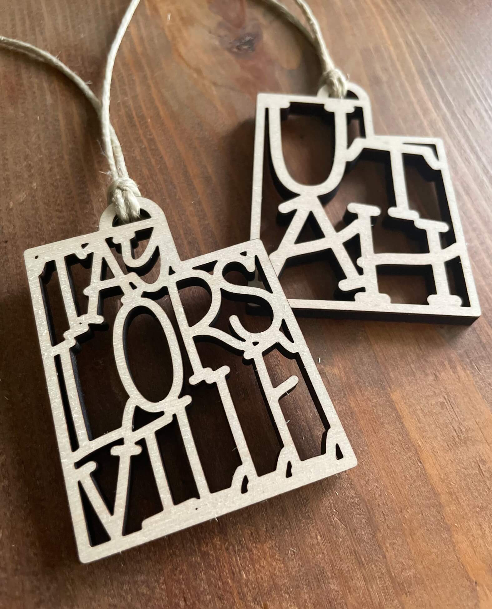 Hand lettered Taylorsville, UT Ornament made out of laser cut wood.